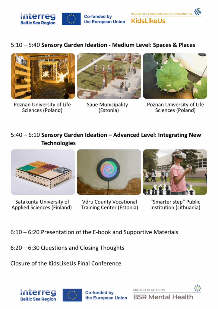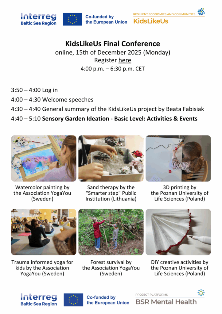 This is the final event of the Interreg Baltic Sea Region project KidsLikeUs: Empowering NGOs & public institutions in helping children overcome migration traumas using creativity and favors of nature. We have worked together with the representatives of artistic, medical, and technical universities, non-governmental organizations, and local authorities to support children affected by migration crises and other mental health challenges by inspiring volunteers, educators, public authorities, and NGOs to create welcoming and sensory-friendly environments that bring nature in, address all senses,  and improve mental and physical well-being. Join our event and find out about the results of the KidsLikeUs project, inspiring ideas, and real-life success stories, receive free templates, and start introducing the change in your surroundings for the benefit of children and all of us!