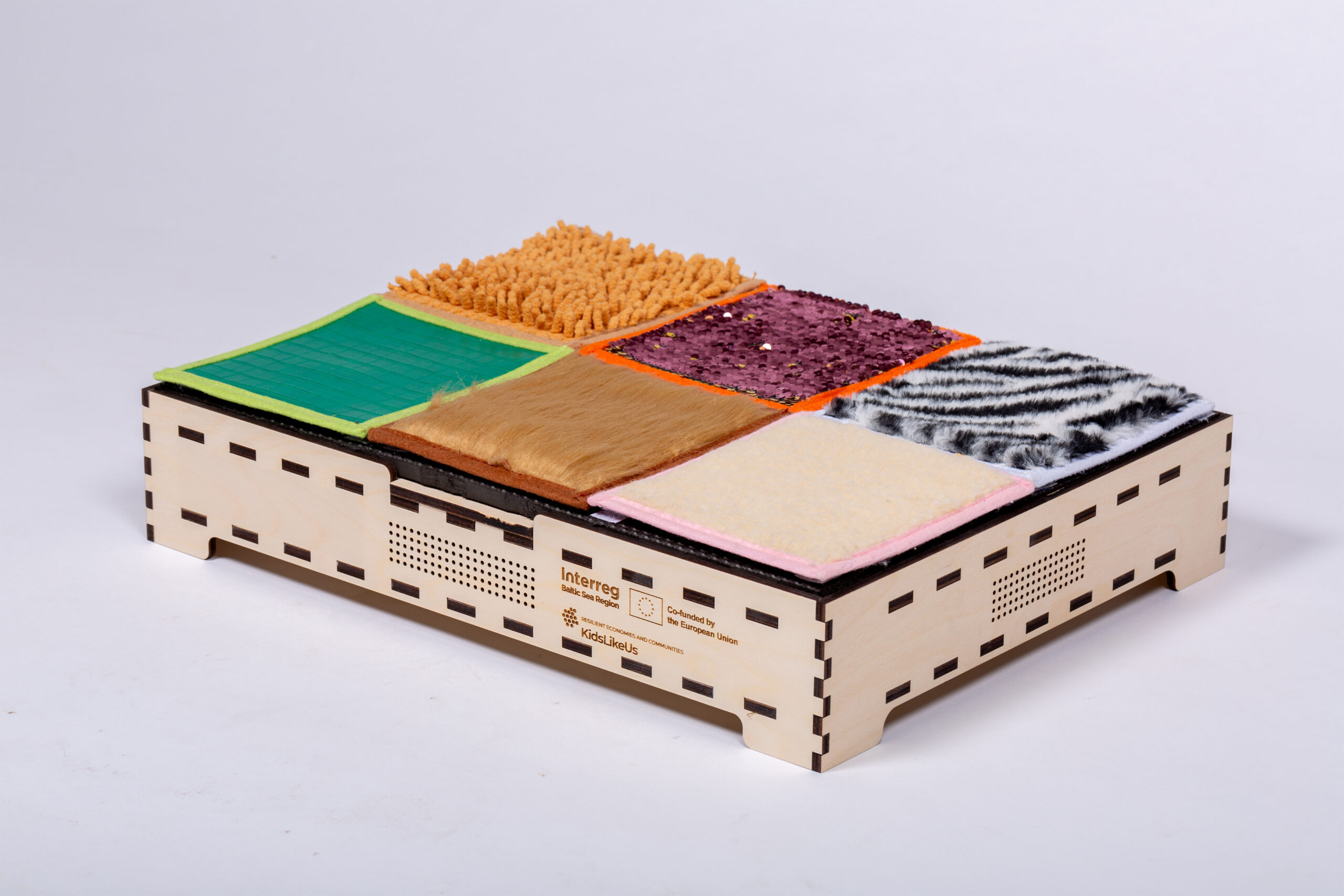 The sensory board consists of six sensory textile modules. Pressure detection sensors (one per module) are seamlessly integrated to each tile. All sensors are connected to the board computer and a speaker. When a child touches the surface of the tile, the sensors become activated and start playing a sound or music. Audio files are available on a memory stick, corresponding to six animal sounds.Â