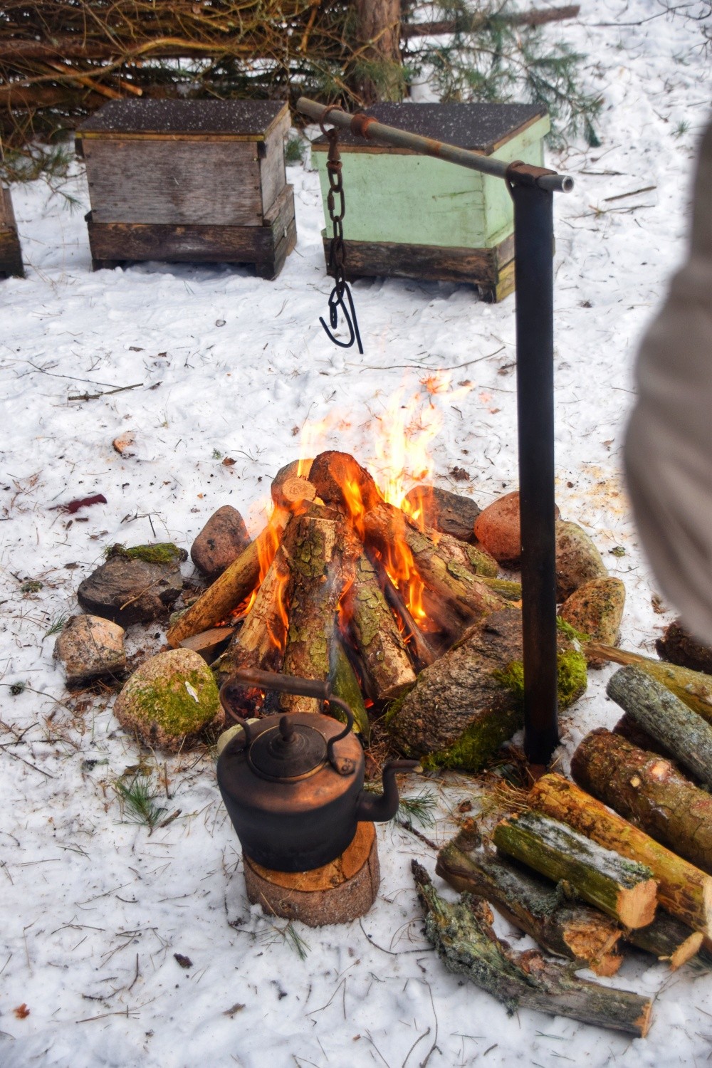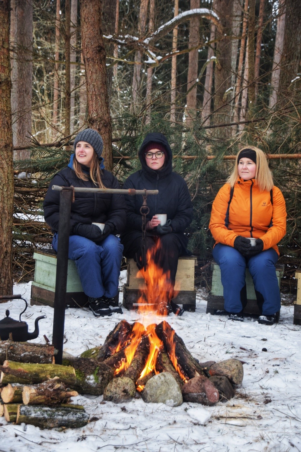 The experience concludes back at the farmstead with a simple tea ceremony by the campfire — creating a warm and reflective ending that contrasts with the stillness of the forest walk.