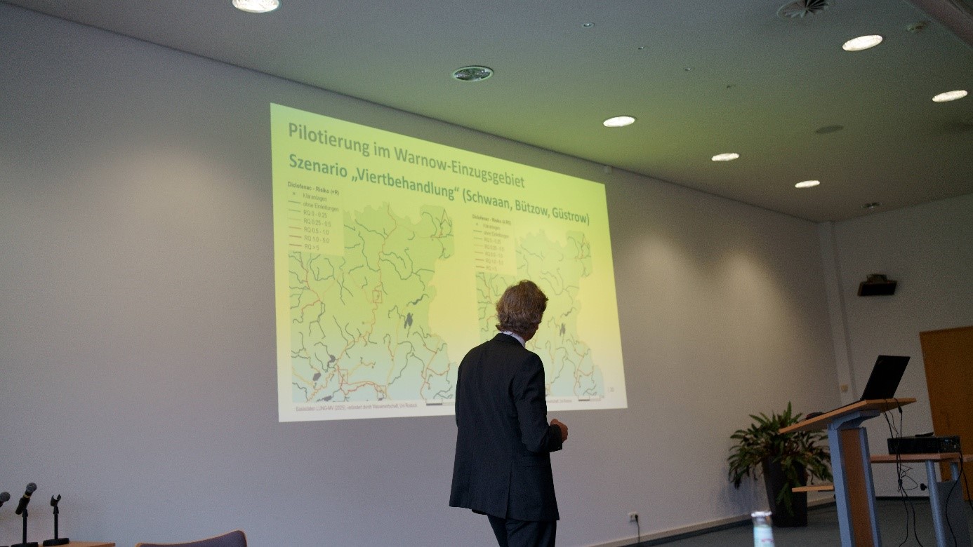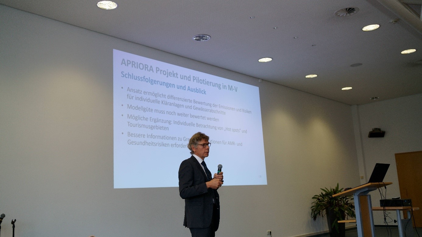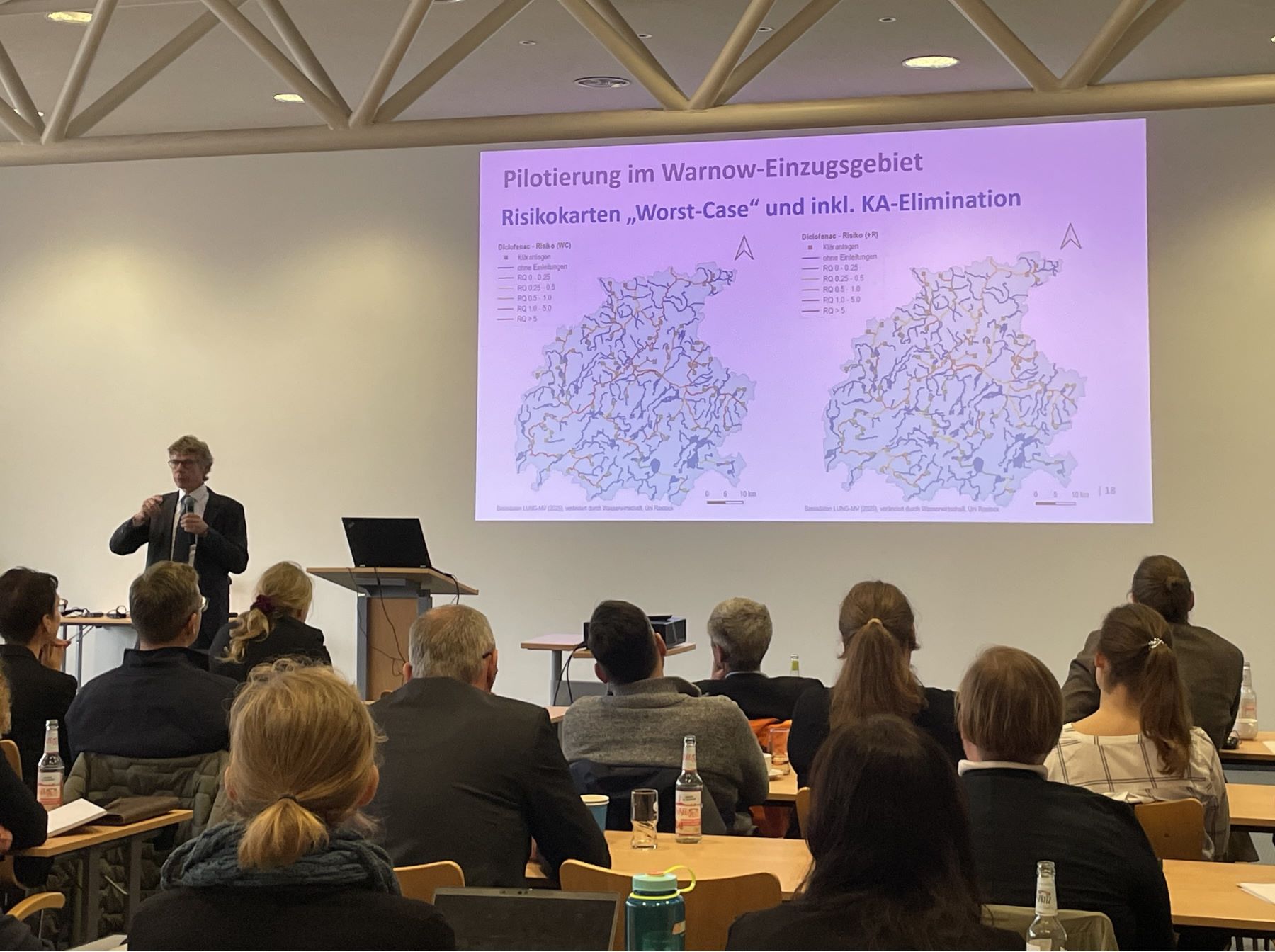 Together with our associated organization, the State Agency of Environment, Nature Conservation & Geology, the APRIORA team was delighted to be part of the conference. In the second thematic section, ‘Requirements for wastewater treatment’, Jens Tränckner from the University of Rostock presented the APRIORA project. In accordance with the current status of the project, preliminary regional pilot results were demonstrated. In this context, model-based risk ratios for the German Warnow catchment area were exemplarily shown in risk maps for well-known pharmaceuticals carbamazepine and diclofenac. Additionally, the potential upgrade by quarternary treatment of three relevant wastewater treatment plant was integrated as mitigation measure, so that regional experts could compare catchment risk maps before and after the implementation. This was highly relevant for our target group of plant operators, who are in charge of finding cost-effective options at their facilities with the most promising effect of risk reduction. The findings of the emission and transport modelling in the Warnow catchment area were also validated with monitoring data provided by the regional authorities, our second main target group.