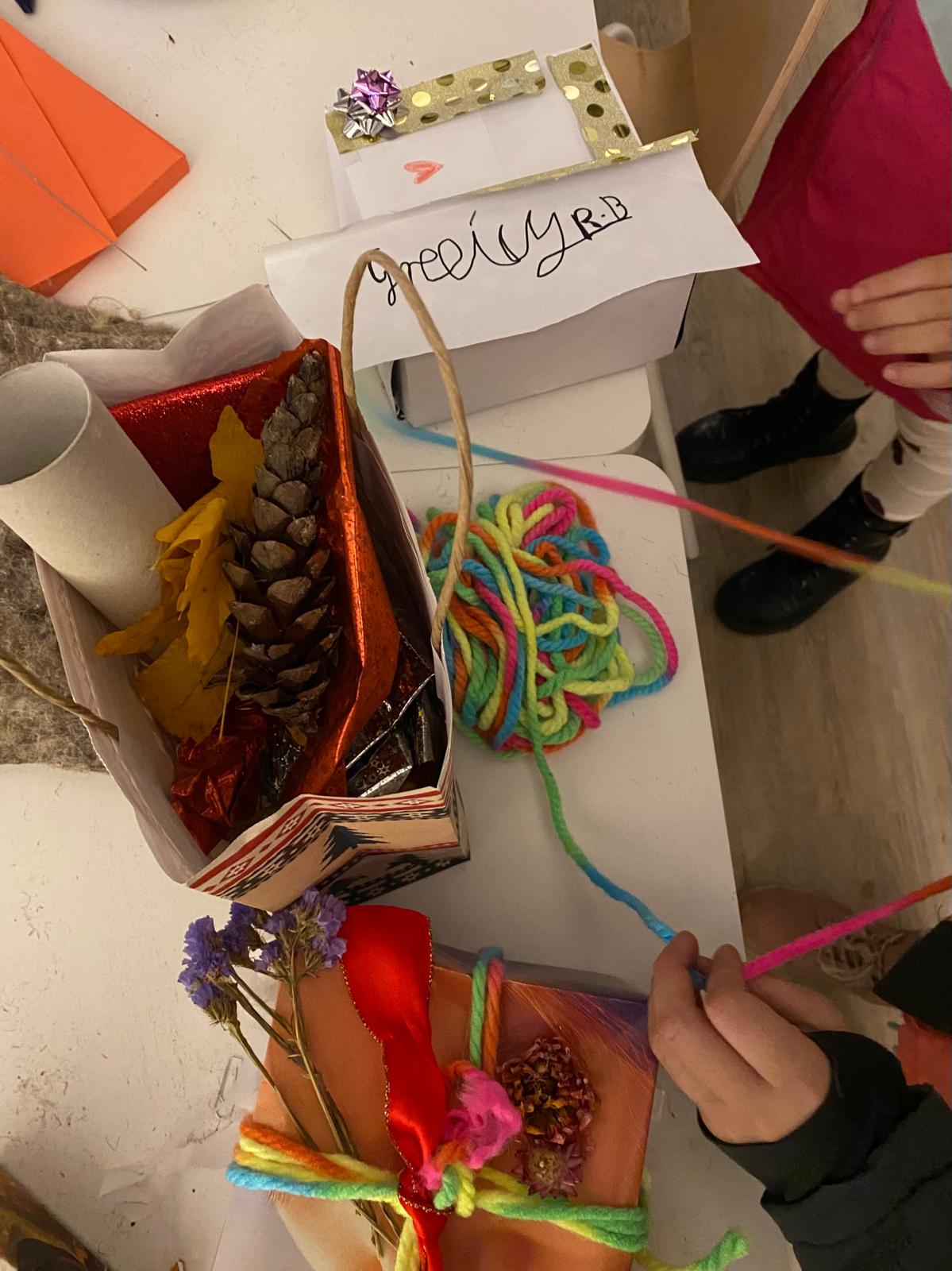 With tea, cookies, and a warm, welcoming atmosphere, visitors were invited to wrap gifts, craft, and connect with each other. Only materials that had already been collected or reused were provided: gently used wrapping paper gathered in advance, various packaging materials, and even old movie posters kindly donated by a local cinema. This creative reuse meant that no new materials had to be purchased, and it naturally introduced sustainable thinking without explicitly placing sustainability at the center of the workshop.
