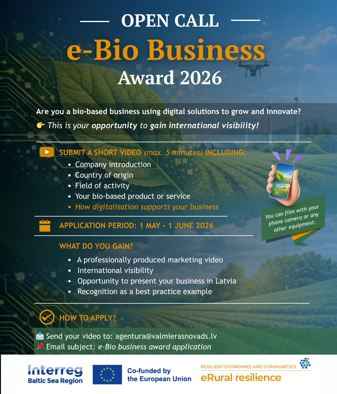 The e-Bio Business Award, organized within the “eRural Resilience” project, is now open for applications across all partner countries. We are looking for inspiring bio businesses that combine sustainability with digital innovation.