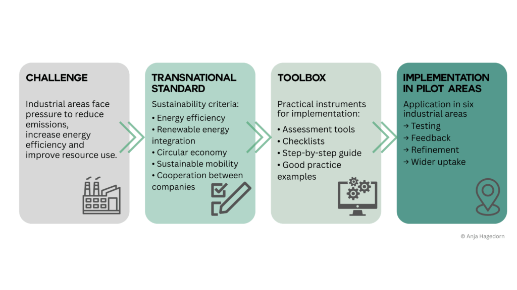 Rather than producing abstract recommendations, the partners set out to create a concrete and transferable framework that could be used by public authorities and industrial stakeholders alike. The result was the Transnational Green Industrial Area Standard, supported by a practical toolbox.