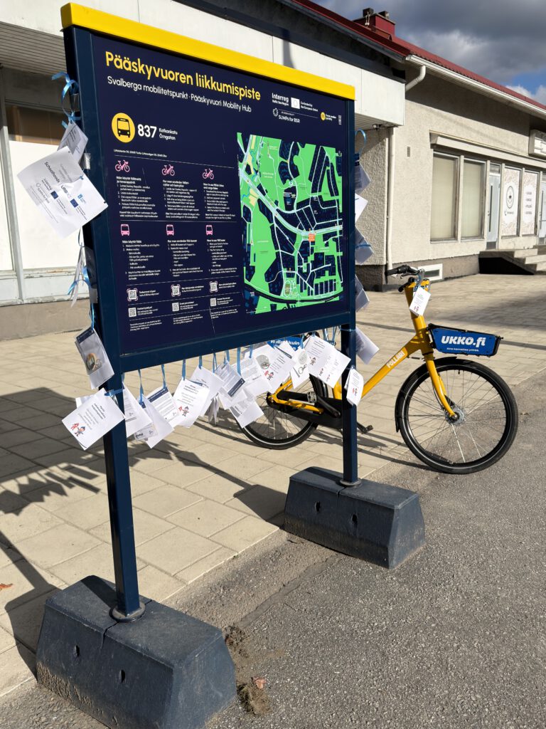 City of Turku has been piloting its first mobility hub in the area that has brought together a bus stop on a heavily operated trunk line, Fölläri city bikes and rentable e-cargo bikes. To boost the collection of feedback on the user experience and needs of the locals related to shared vehicles and public transport, the City of Turku participated in the Pääskyvuori Day.
