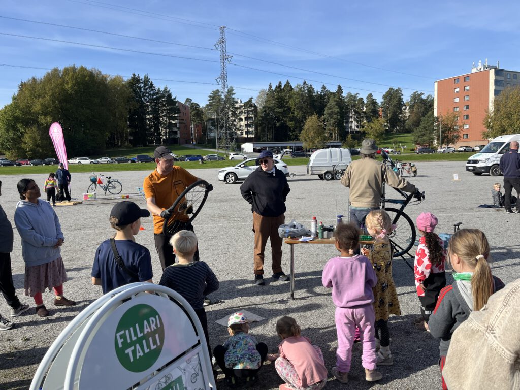 Turku Bike Kitchen’s bike repair show caught the eyes of the participants, and several families learned bike repair tricks