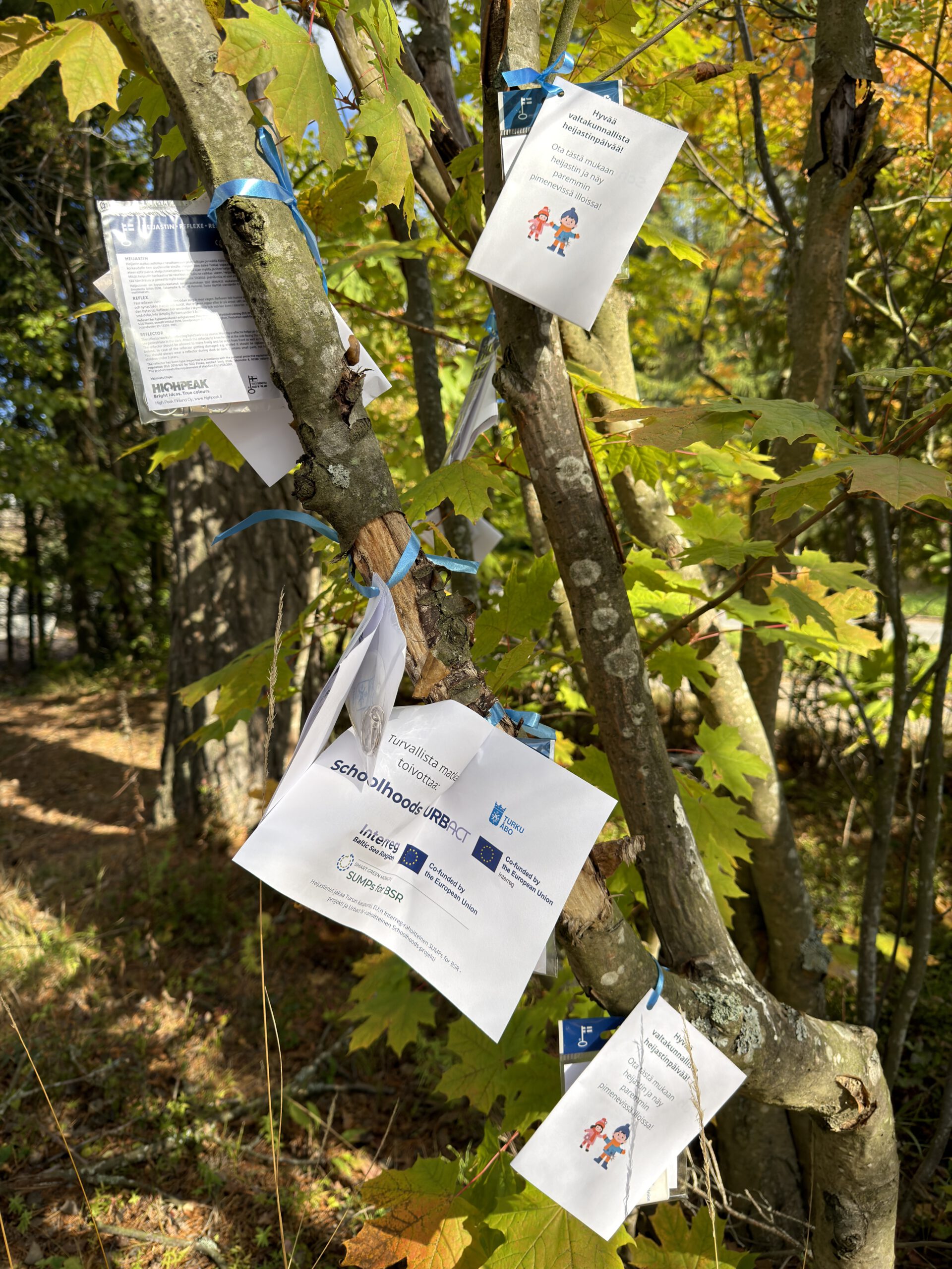Finnish Road Safety Council Liikenneturva launched a National Reflector Day in 2013, and since then it has been celebrated on the first of October. City of Turku partook in the celebration this year by spreading reflectors provided by the project, the city and Turku Region Traffic around Pääskyvuori. Reflectors were hung on the mobility point sign, roadblocks and along pedestrian and cycling paths. Each reflector had a cover letter explaining the campaign and promoting the project.