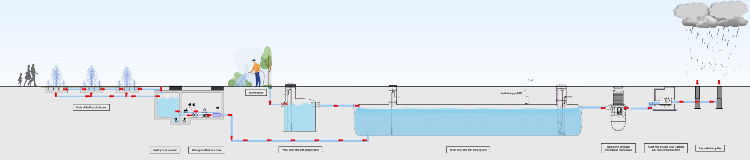 A few key facts and figures: technically, the concept envisages an underground retention tank with a volume of 90 m³, plus a multi-stage filtration system including UV disinfection and a monitoring system that records storage levels, water quality and water use in real time. A digital information screen on the square will explain the functioning of the system and display the main figures in real time. How much water is currently stored? What can it be used for? How much drinking water is being saved?