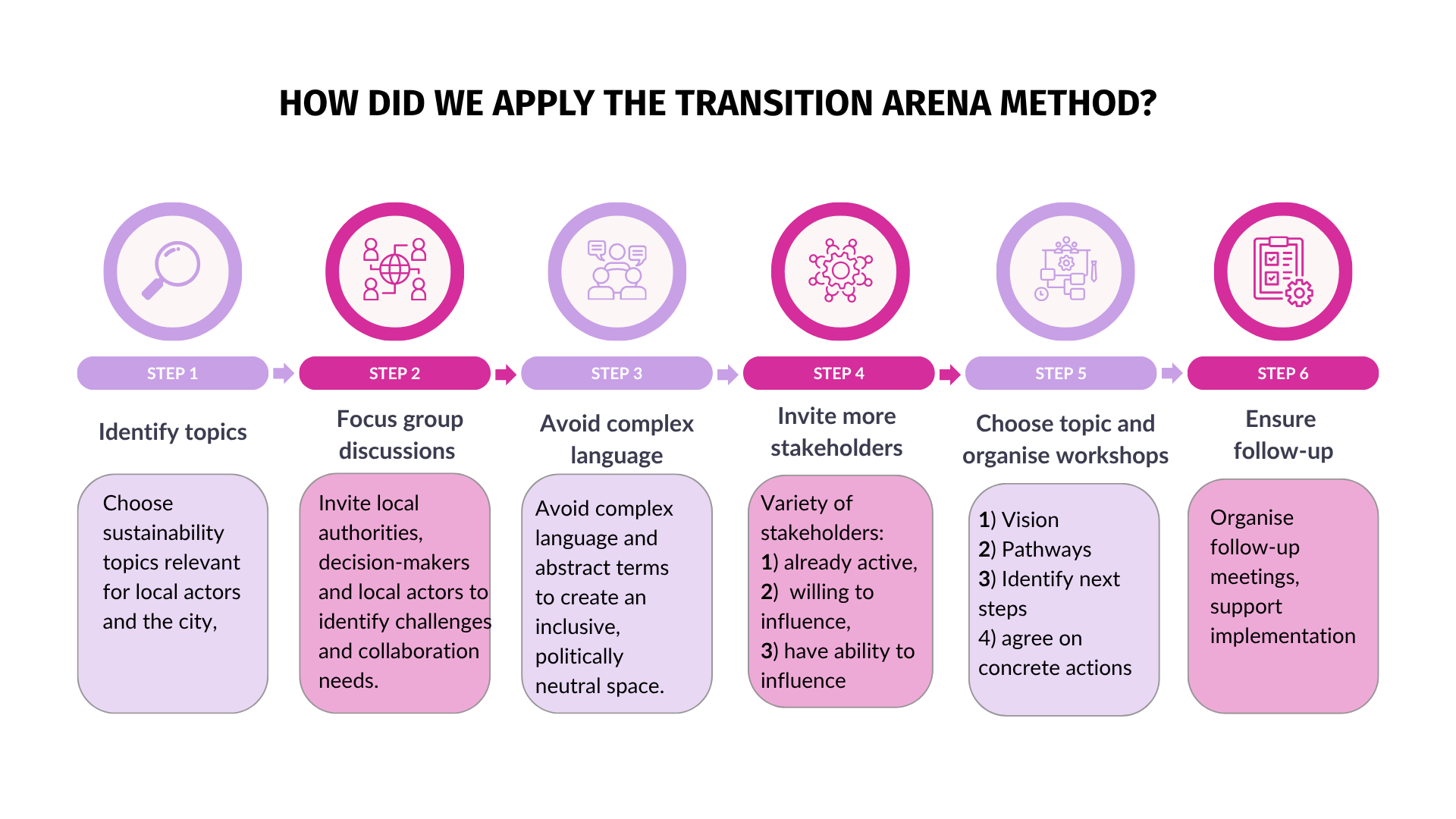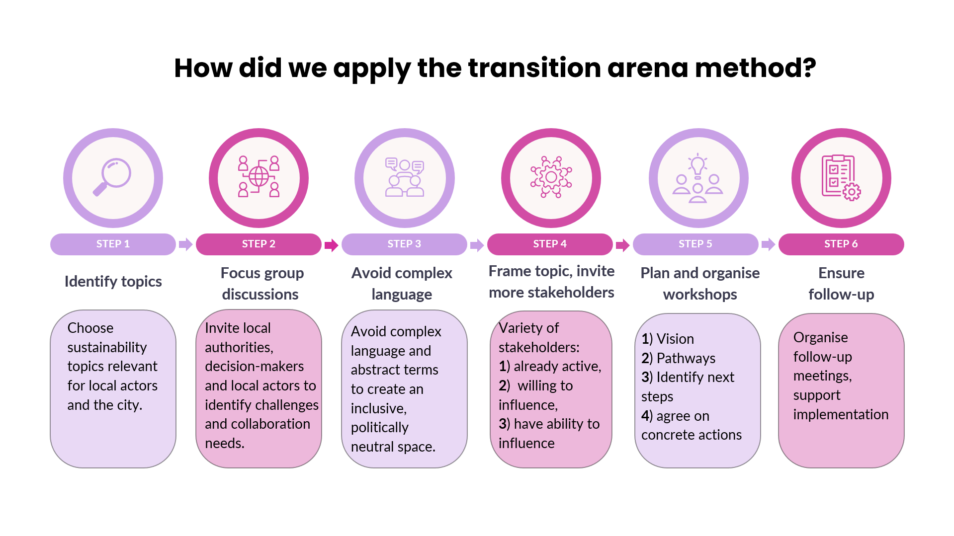 We make transition! project adapted the ‘Transition Arena’ workshop method in a practical way to promote interaction, co-creation and transformative cooperation between local/regional authorities and civil society, business and other small local actors. We make transition! implemented local transition arena processes in 12 locations around the Baltic Sea Region. Each transition arena had a unique sustainability topic that was chosen and framed based on the local interests and cooperation needs.